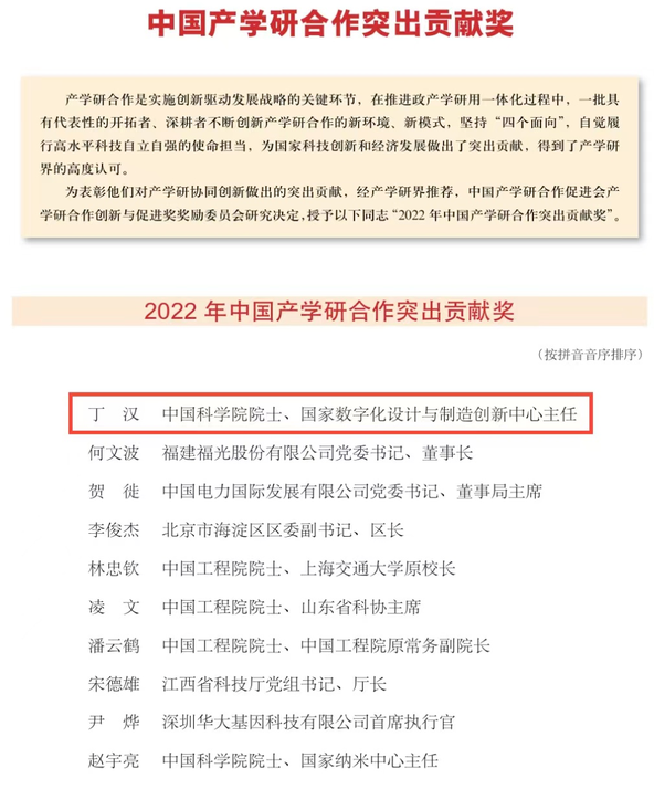 國家級!丁漢院士榮獲2022年中國產(chǎn)學(xué)研合作突出貢獻獎